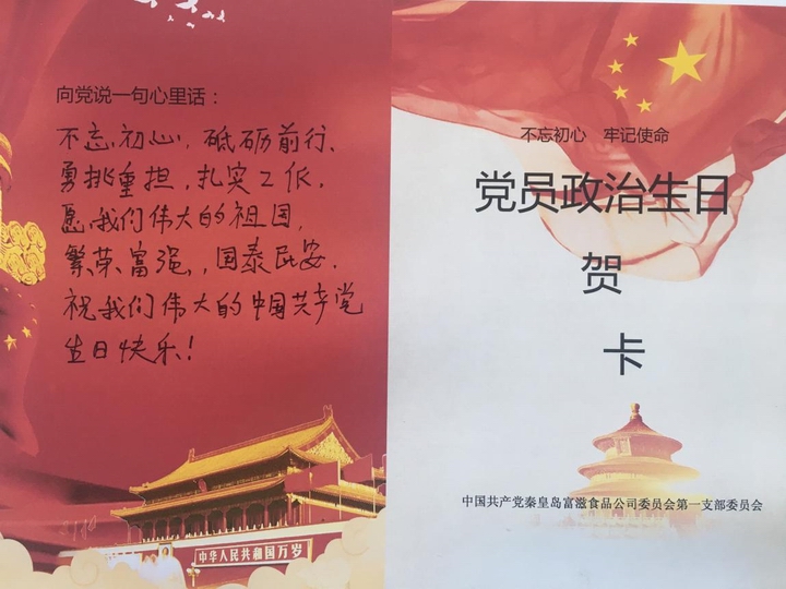 秦皇岛富滋:秦皇岛富滋第一党支部为全体党员过了一次特别的“政治生日”,每名党员收到了一个特别的礼物--政治生日贺卡,大家回顾入党历程,追寻入党初心,向党述说自己的心里话,极大激发了全体党员的知党、爱党、颂党、护党热情。