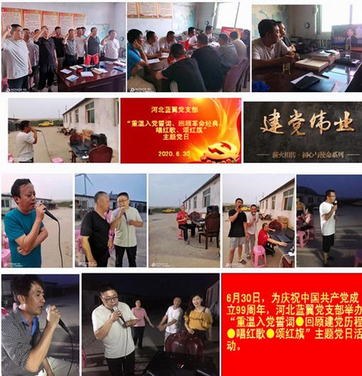 河北蓝翼:6月30日,河北蓝翼党支部为庆祝中国共产党成立99周年,在生产养殖基地组织开展了“重温入党誓词、回顾建党历程、唱红歌、颂红旗”主题党日活动,使支部全体党员经历了一次深刻的精神洗礼和党性锤炼。