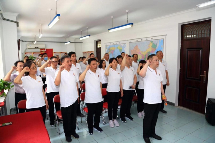 党旗就是责任 6月30日组织新党员进行了入党宣誓,老党员再次重温入党誓词,誓词虽然只有80个字,但字字千钧重、句句含义深,蕴涵着非常丰富的内容,既是一份政治誓言,也是一份忠诚誓言,更是一份责任誓言,高度凝结了党员应履行的责任和义务,应遵守的纪律和规矩,时刻告诫党员同志永远保持清醒,不忘党的性质、牢记党的宗旨。知者行之始,行者知之成,要知行合一,才能推动工作,勇于担当、奋勇前行。