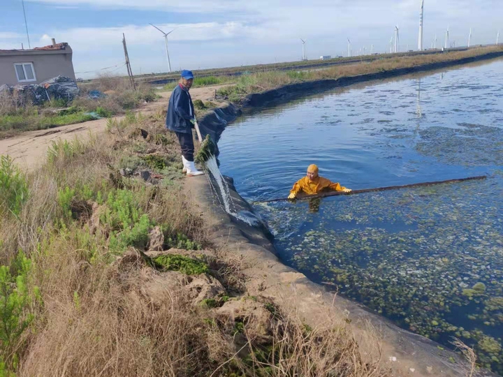 其次,控制水草。水草疯长是海参养殖的大敌,尤其在高温期,死亡的水草会导致圈底大面积缺氧、硫化氢中毒、氨氮超标、漂参死亡等现象。因此,控草最好从低温开始,越早越好。为此,河北蓝翼从开春后就开始了捞草大战,公司班子成员全都投入到劳动之中,为职工做出表率。