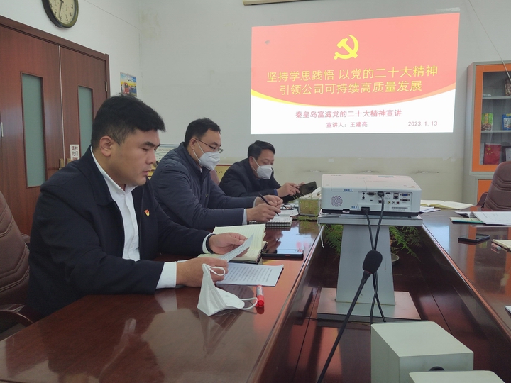 为深入学习贯彻党的二十大精神,推动党的二十大精神在秦皇岛富滋生根开花,按照省外贸资产公司党委安排部署,1月13日上午,秦皇岛富滋食品有限公司组织召开党的二十大精神宣讲会,公司党委书记、董事长王建亮以《坚持学思悟践,以党的二十大精神引领公司可持续高质量发展》为题作宣讲报告,中层及以上干部和全体党员参加了会议。